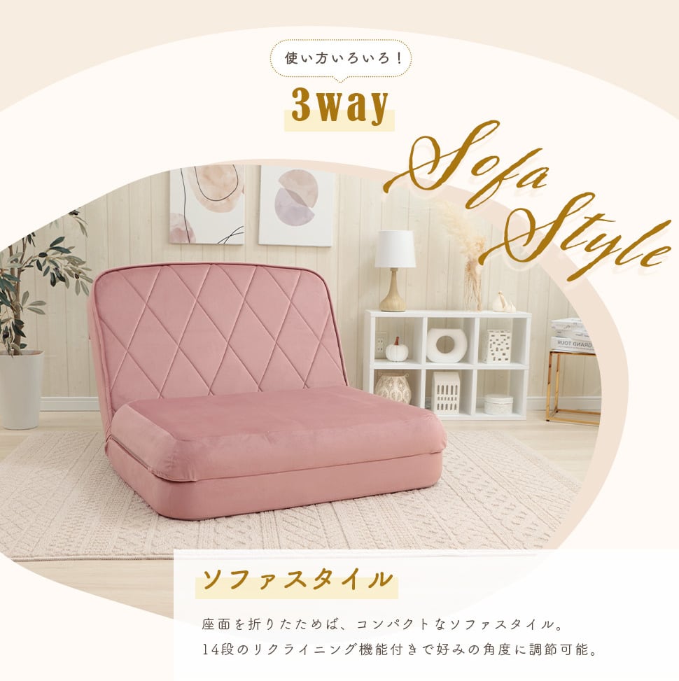 ソファベッド ソファ カウチソファ 3way コンパクト ダイヤモンドキルト ベロア 一人暮らし ワンルーム くすみカラー 上品 高級感 大人かわいい リクライニング