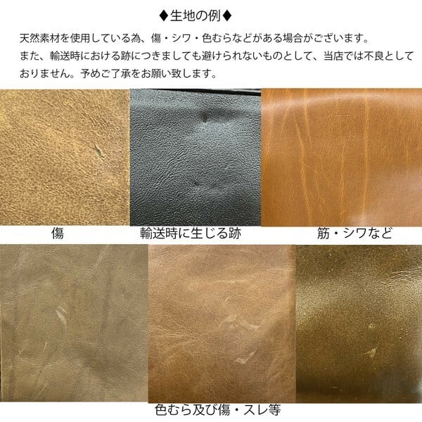 ※こちらの商品は革を使用しておりますので、表面の傷・シワ・色むら・筋(血筋)がございます。1点1点状態が異なりますので、革の個性としてお楽しみいただき、これらをご了承の上ご注文をお願い致します。