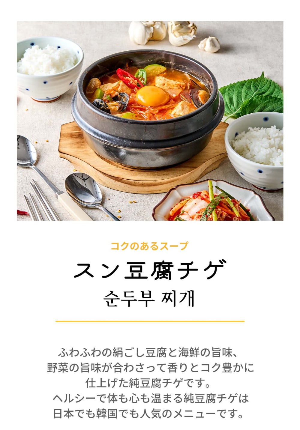 おうちで本格的な韓国料理を楽しむことができるスン豆腐チゲキット。ぜひ一度お試しください。